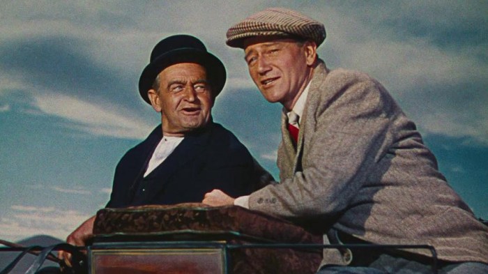 The Quiet Man is a 1952 romantic comedy-drama directed by John Ford, starring John Wayne, Maureen O’Hara, Barry Fitzgerald, Ward Bond and Victor McLaglen. The film is particualrly notable for Winton Hoch’s lush photography of the Irish countryside and a long, climactic, semi-comic fist fight. The Quiet Man won the Academy Award for Best Director for John Ford, his fourth, and for Best Cinematography.