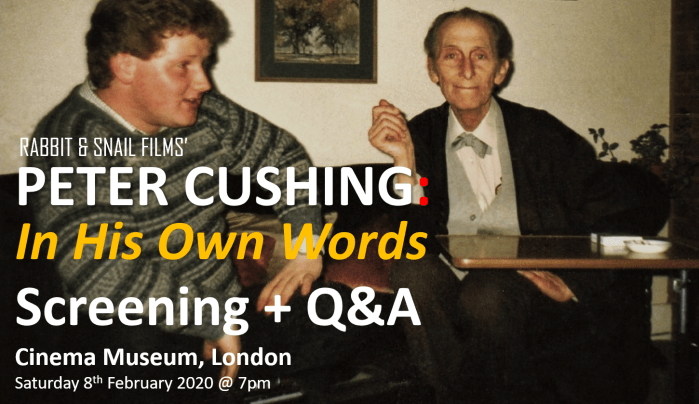 We’re really excited to announce a gala screening of our feature documentary, PETER CUSHING: In His Own Words at 7pm on Saturday 8th February 2020 at the Cinema Museum, Kennington, followed by a special Q&A hosted by Morris Bright MBE, who will be joined on stage by director Richard Edwards, contributors Derek Fowlds, Madeline Smith, Judy Matheson, Brian Reynolds, Phil Campbell and narrator Jenny Hanley.